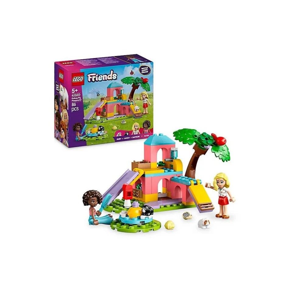 Конструктор LEGO® Friends «Ігровий майданчик для морських свинок» (42640) з 2 міні-фігурками ляльок LEGO Friends та 2 фігурками морських свинок для годин веселих рольових ігор. Ідеально підходить для хлопчиків, дівчаток та любителів тварин віком від 5 років, які люблять створювати пригоди зі своїми морськими свинками.