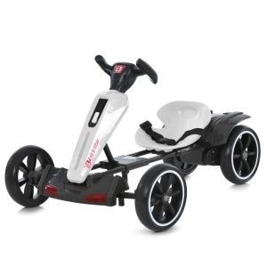 Електрокарт обладнаний двома потужними двигунами та якісним акумулятором, які забезпечують впевнений розгін та довгу роботу без підзарядки. Колеса з покриттям з EVA гарантують м'який хід навіть нерівними поверхнями, зменшуючи вібрацію і роблячи поїздку комфортною. Ця модель має зручне сидіння ергономічної форми, що допомагає дитині почуватися впевнено за кермом.<br>