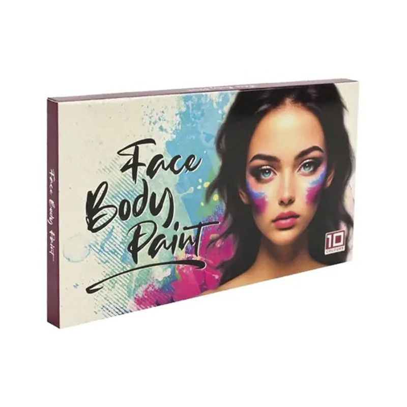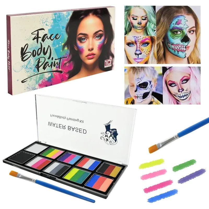 У комплекті є зручна палетка з 10 насиченими кольорами та пензлик для акуратного нанесення. Фарби легко наносяться, добре змішуються між собою та змиваються водою після використання.