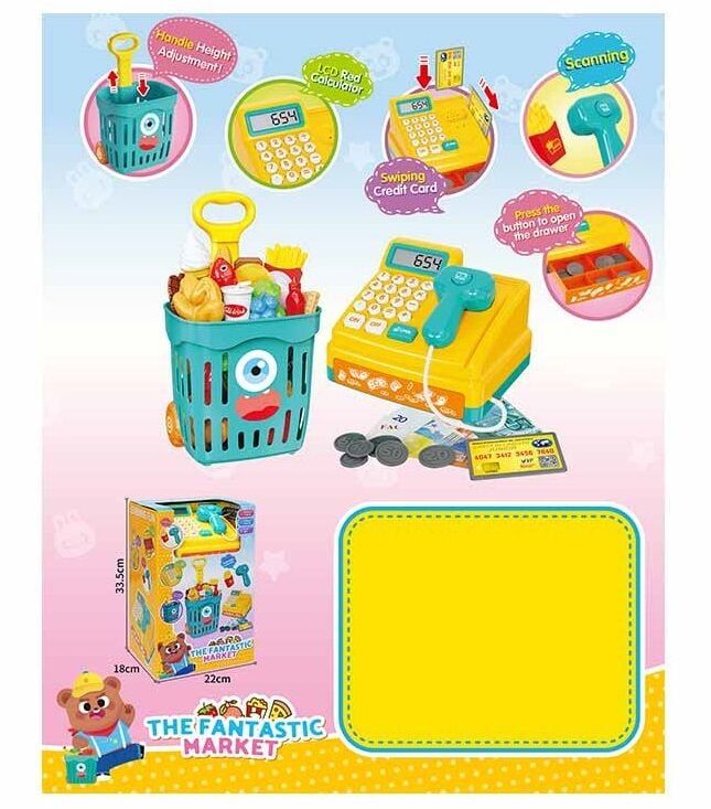 Дитячий Касовий апарат (35654) звуки, підсвічування, калькулятор, муляжі грошей, муляжі продуктів, кошик для супермаркету