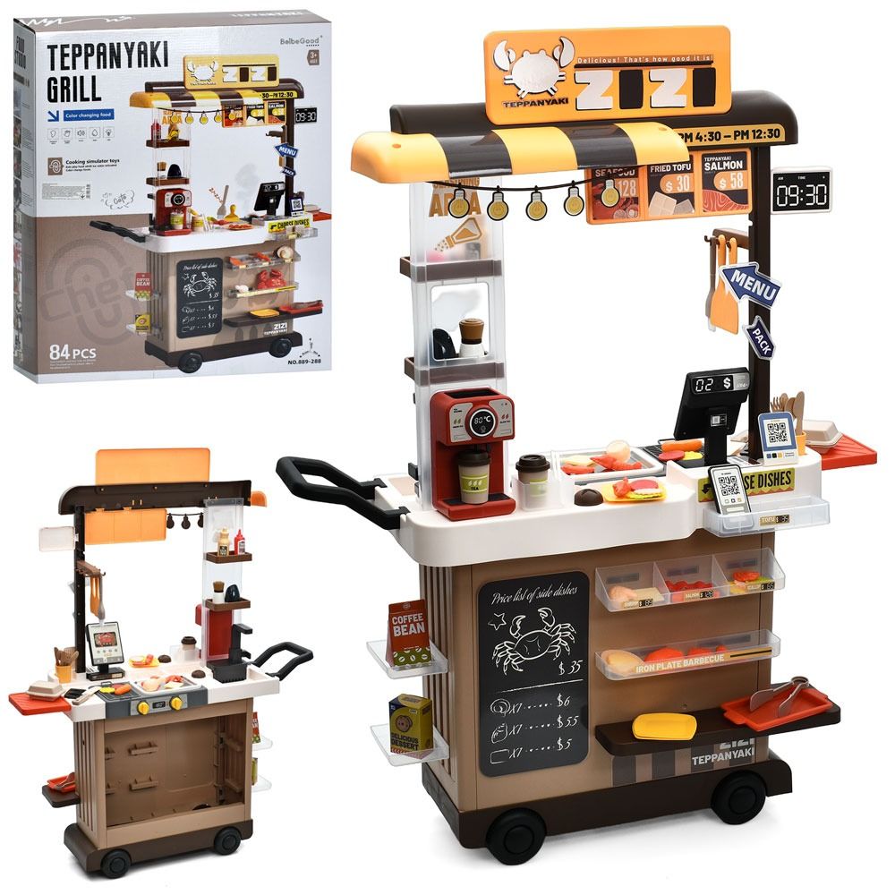 Комплектація: прилавок-візок, плита, мийка, каса, кавоварка, продукти, гроші, аксесуари, 84 предмети; </li>
