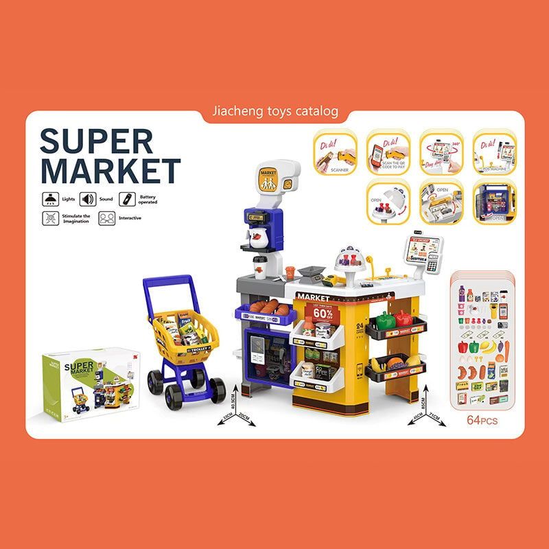 Дитячий Супермаркет (668-141) 64 елементи, світло, звук, касовий апарат, сканер, візок для покупок, кавомашина, полиці, продукти, купюри, монети