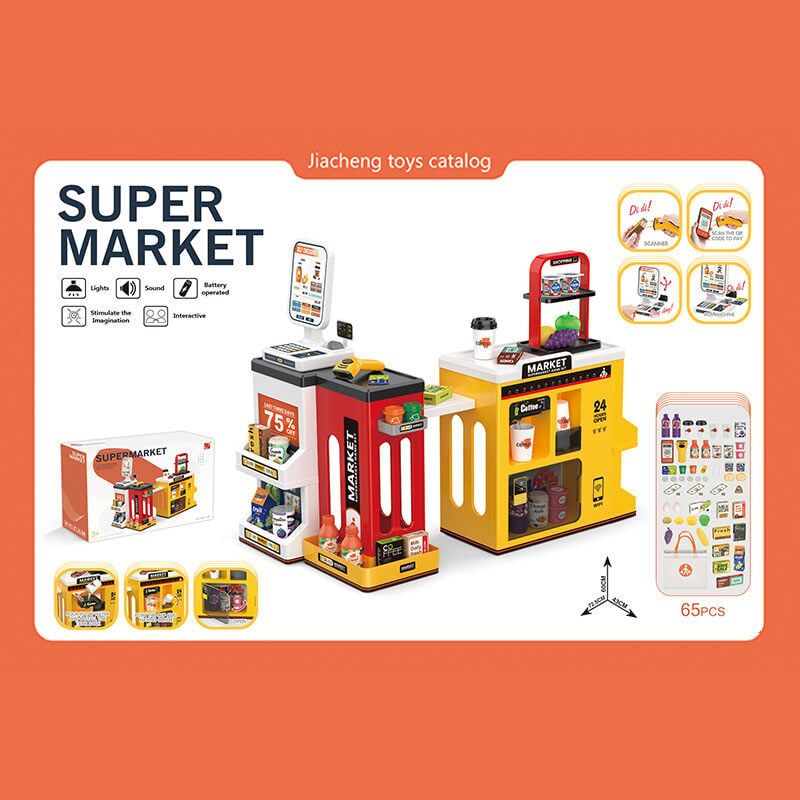 Іграшковий супермаркет - кращий за справжній! Бо правила його роботи ти визначаєш сам! До ігрового набору входять 65 деталей. Це елементи каси зі столом, полицями та кавомашиною, а також різноманітні аксесуари, що урізноманітнюють ігровий процес. Сканер та касовий апарат відтворюють характерні звуки. Іграшка однаково сподобається як дівчаткам, так і хлопчикам. <br>