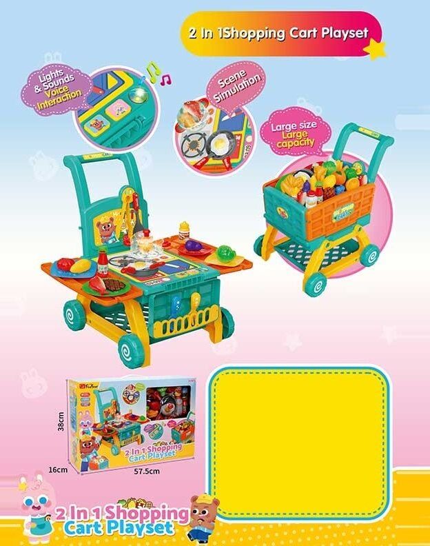 Набором посуду нікого не здивуєш. А як щодо набору з візком для продуктів, який легко трансформується в портативну кухню та навпаки? Імітація плити дозволить будь-якій дитині відчути себе справжнім шеф-кухарем. Варто натиснути на кнопку, що знаходиться на ігровій панелі плити, як одна за одною почнуть лунати мелодії та звукові ефекти. Друга кнопка відтворює фрази англійською мовою. Підсвічування різними кольорами зробить гру ще яскравішою та захопливішою. Портативна кухня обладнана не лише плитою, але й відсіками для харчових продуктів, посуду, столового приладдя. Реалістичні муляжі харчових продуктів (овочі, яєшня, риба, соуси тощо) виглядають так апетитно, що аж слинка тече! Ігровий набір чудово підходить для гри наодинці або з друзями чи батьками - дома та на вулиці. <br>