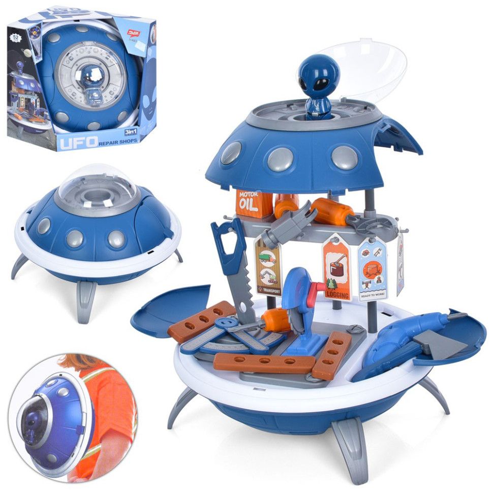 Оригінальний дизайн: Стіл-майстерня оформлений у незвичайній та привабливій формі літаючої тарілки (UFO), що виділяє його серед класичних наборів інструментів.
