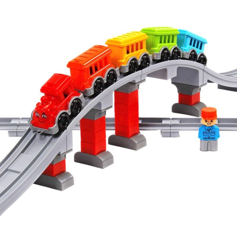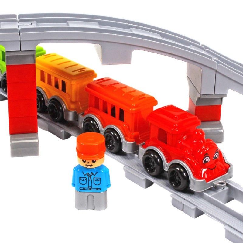Ваш малюк буде в захваті, збираючи власну залізницю з яскравим поїздом, що складається з локомотива з доброзичливою посмішкою та чотирьох різнокольорових вагонів.