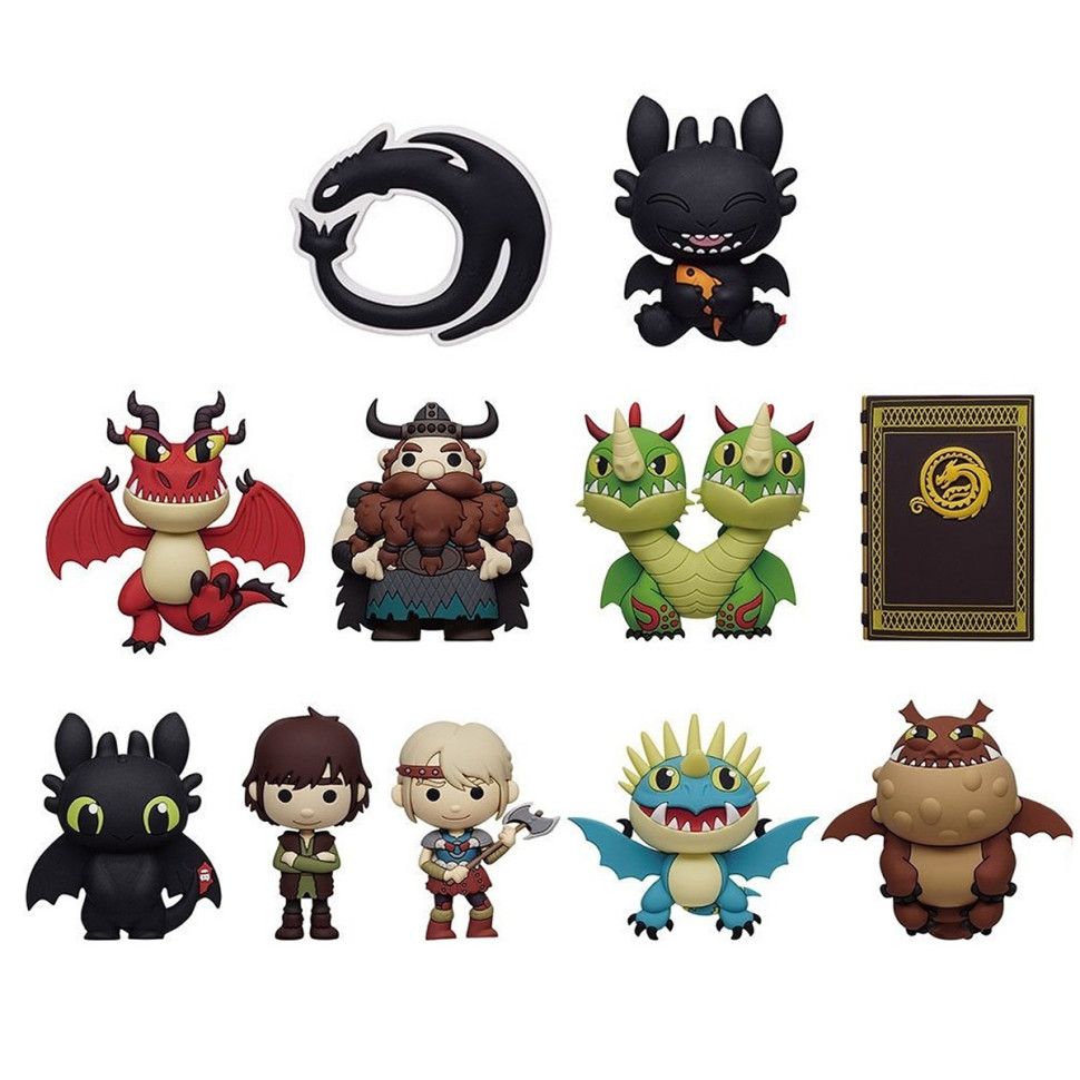 В асортименті 11 головних героїв з яких 2 рідкісних: Беззубик, Гикавка, Астрід, Буревійка, Сарделька, Іклогак, Стоїк, Блювко та Відриг, Книга драконів, Логотип з драконом (рідкісний) і Милий Беззубик (рідкісна).