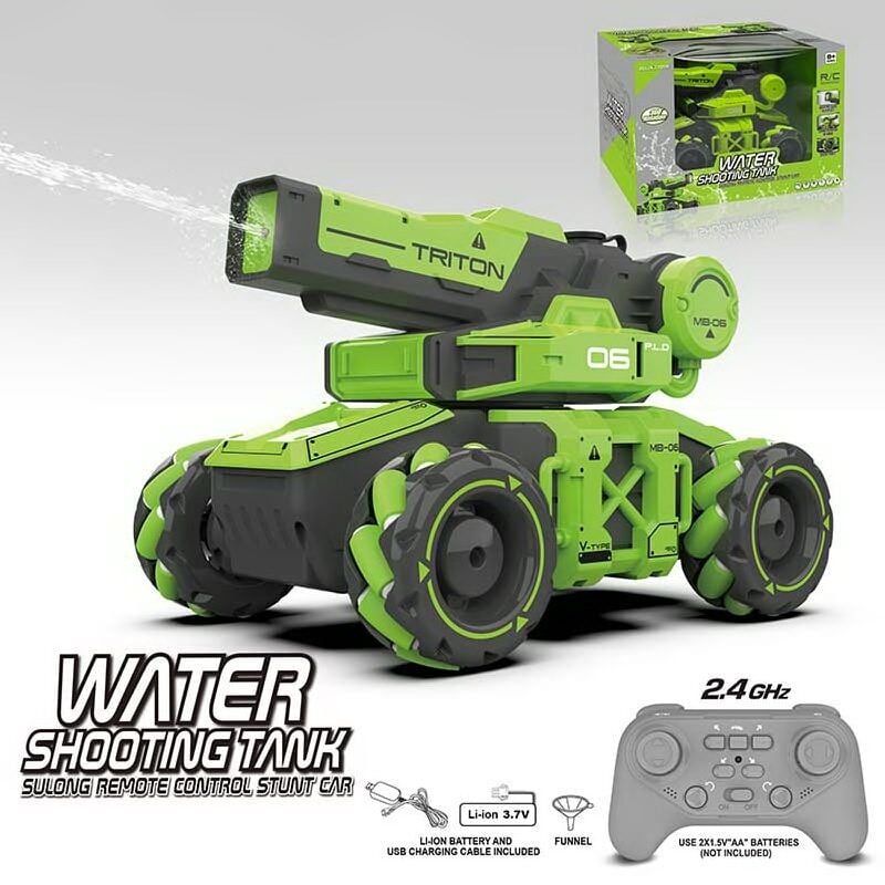 Потужний танк, який випускає не вогонь, а воду! Іграшка має сучасний яскравий дизайн. Керування відбувається за допомогою пульта 2,4 GHz. Танк швидко рухається по рівній поверхні: вперед та назад, повертає праворуч та ліворуч, а також автоматично обертається по колу. Крім того, машина може ковзати вправо та вліво; пересуватись на 4-х колесах або лише 2-х. Для того, щоб танк почав стріляти водою, достатньо зафіксувати лійку у спеціальному отворі на башті, налити у вбудований бак трохи води та натиснути на відповідну кнопку на пульті керування. Під час механічного обертання башти танку працює тріскачка. Роликові колеса дозволяють танку маневрувати.
