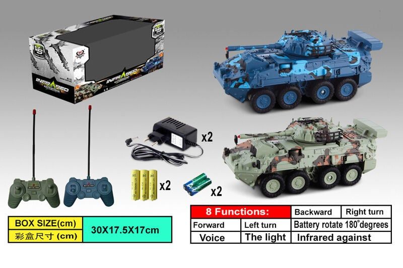 - до набору додаються 2 кабелі для заряджання, 4 батарейки АА 1.5V (для пультів), 6 батарейок АА 1.2V (для танків);