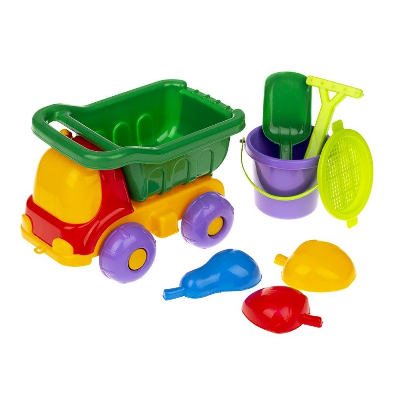 Машина "Бджілка" No3 - великий комплект з машинки-вантажівки, зручного відерця з ситом, грабельок, лопатки і трьох пасочок, який підійде дітям від 3-х років.