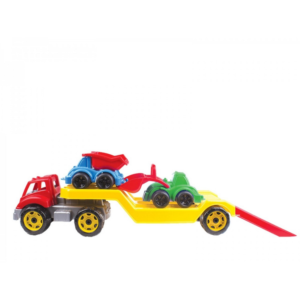 Автовоз - це спеціалізований вантажний автомобіль, спеціально розроблений і використовується для перевезення автомобілів. Цей автовоз перевозить будівельну техніку. Дитині буде цікаво гратися цією іграшкою в пісочниці. З допомогою автовоза можна доставляти машинки на "будмайданчика" для будівництва різних пісочних конструкцій. Машинки з набору будтехніки легко заїжджають на причіп. Граючи з цим набором, дитина розвиває логіку та фантазію і набагато швидше запам'ятовує кольори.