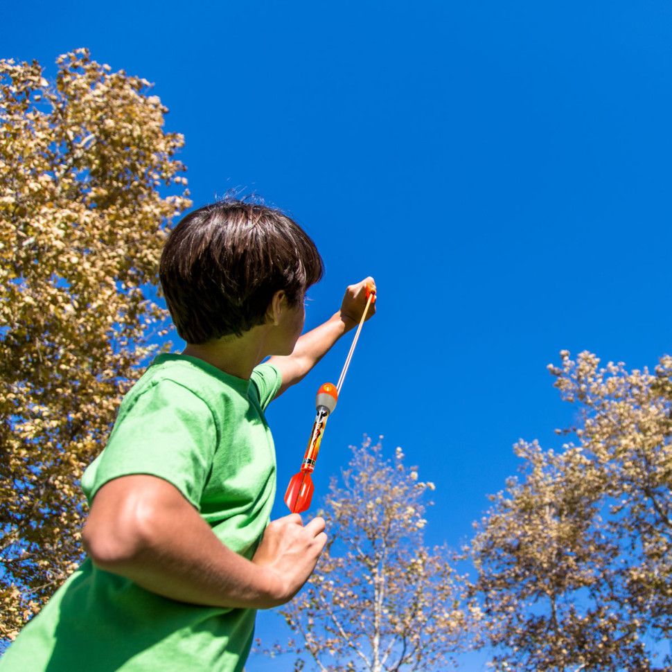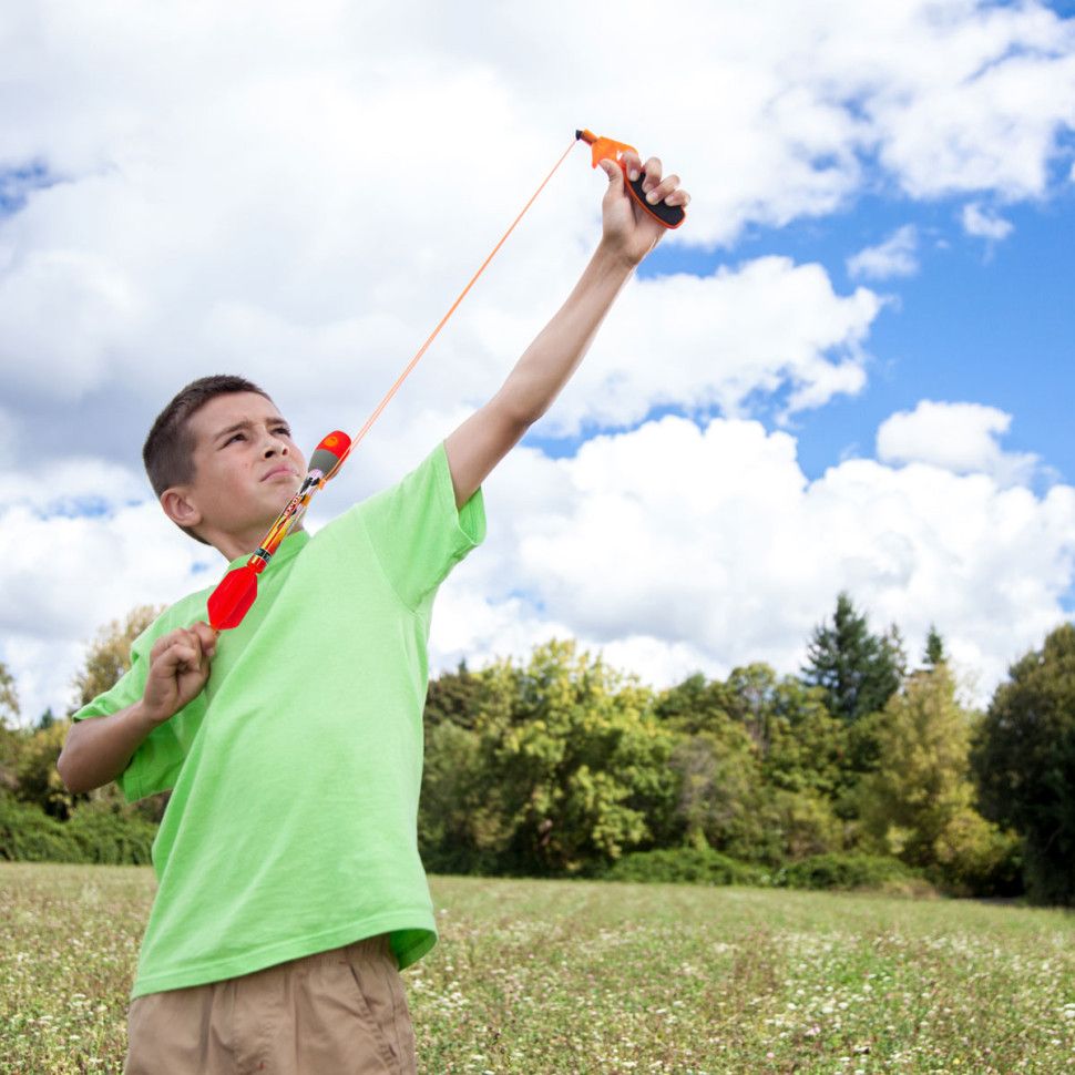 В комплекті спеціально розроблений запускач. Просто зачепіть ракету, відтягніть назад та відпускайте! Все дуже легко!