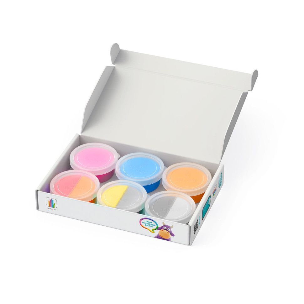 В набір може входити до 12 різних кольорів (баночка може містити пластилін двох різних кольорів).