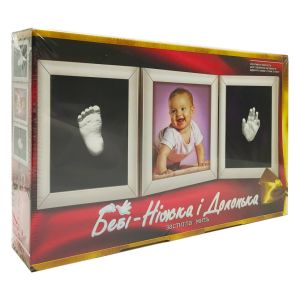 У комплект набору для творчості "Бебі ніжка та долоня": моделювальний гель, порошковий гіпс, контейнер-форма для відбитка ніжки та долоні, подвійна багетна рамка, паспарту, покрокова інструкція.