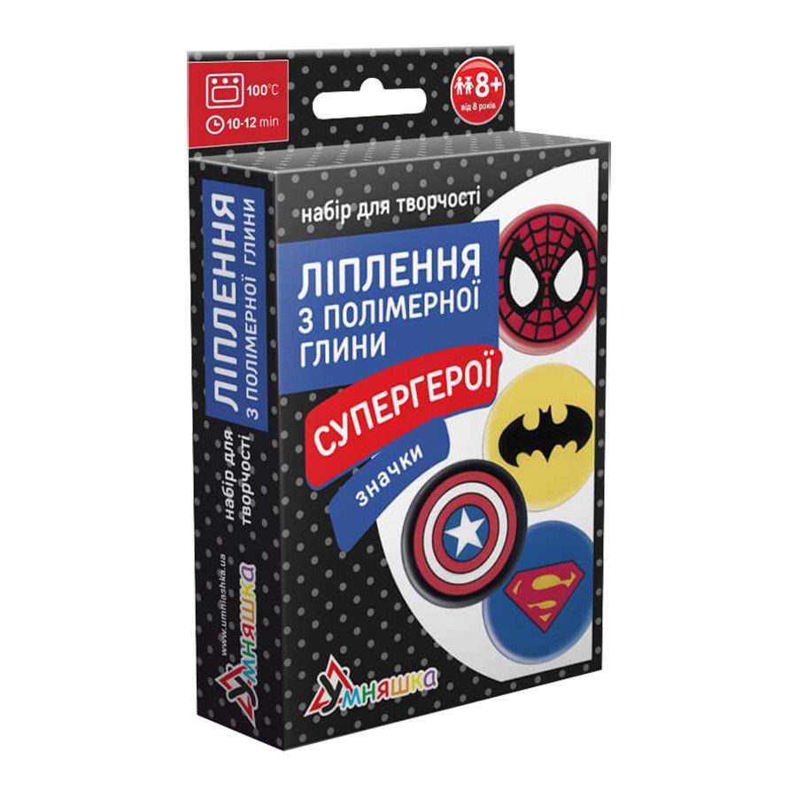 Рекомендований для діток старше восьми років, оригінальний набір для творчості ліплення з полімерної глини "Значки Супергерої" (ПГ-007) PG-007 представлений в покращеній розвиваючії серії української торгової марки «Умняша». Якщо Ваша дитина проявляє інтерес до створення виробів, любить дизайн, декорування та різний креатив, то така розвага не залишить його байдужим. У наборі Ваш маленький творчий геній знайде для себе всі необхідні інструменти, матеріали і докладну фотоінструкцію, яка допоможе розібратися в особливостях техніки навіть початківцям. У комплекті представлена полімерна глина - це унікальний, безпечний пластичний матеріал для ліплення і моделювання, твердне при нагріванні до температури 100-130 ° C після запікання в духовій шафі. Використовуючи цей матеріал, Ваш малюк буде самостійно створювати дивовижні вироби різних кольорів, які він зможе використовувати за призначенням.