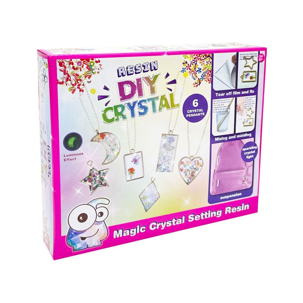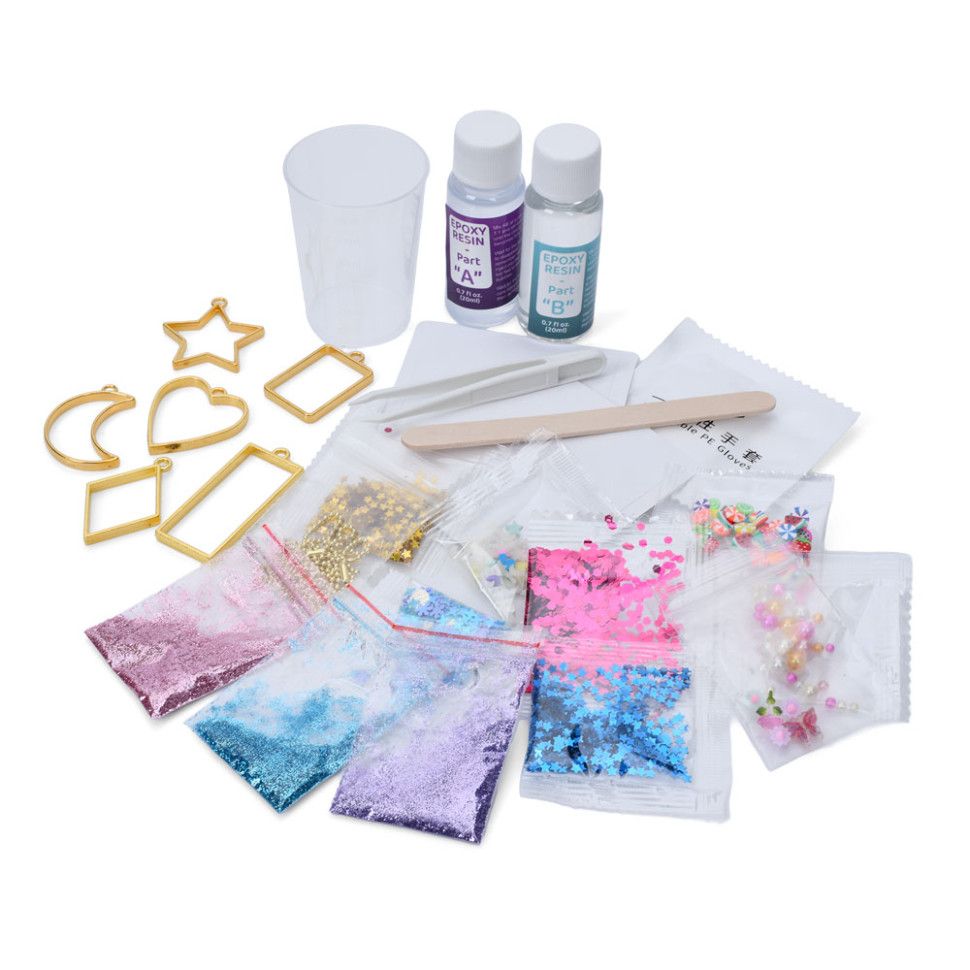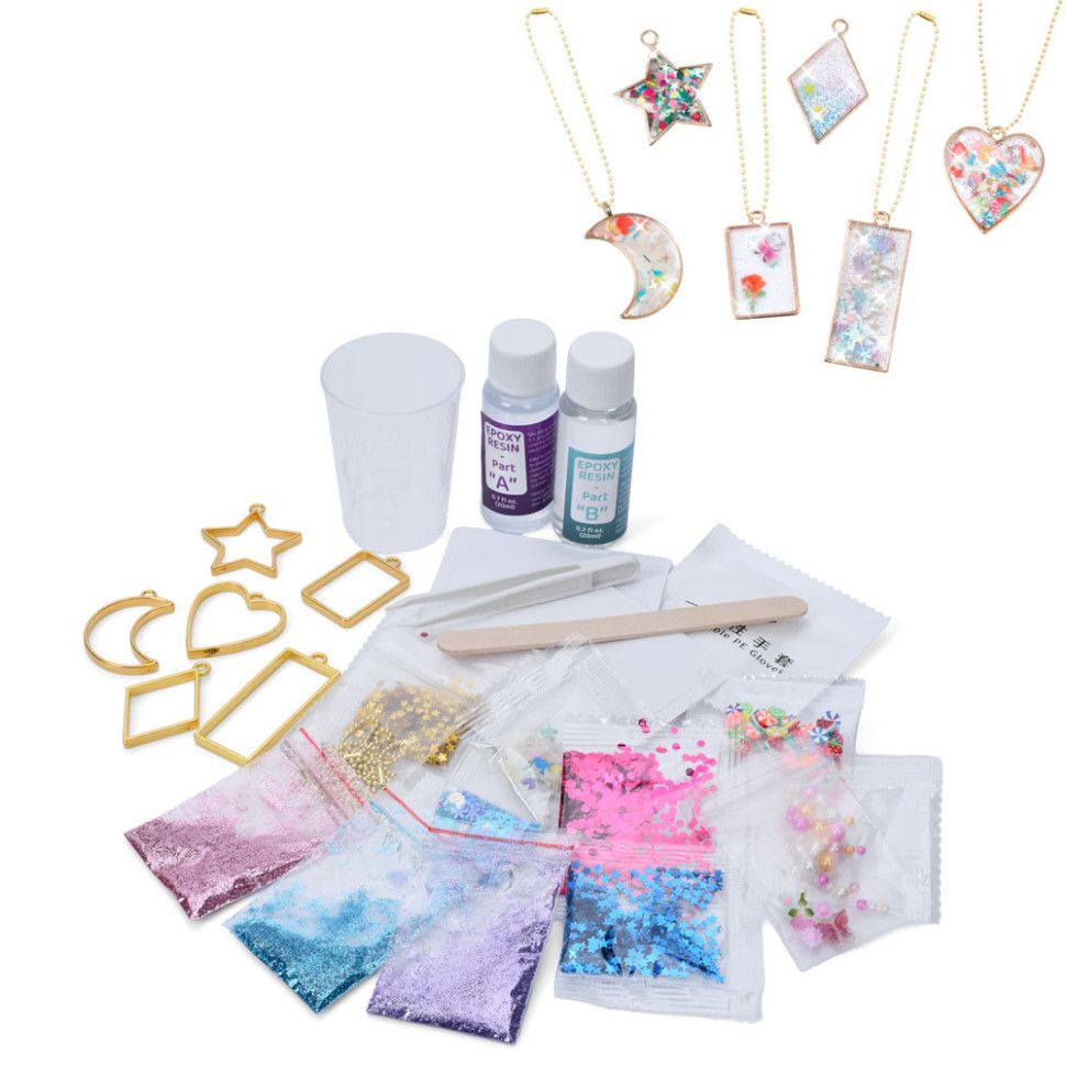 У наборі є 6 форм для підвісок, глітер, фігурки для прикрашання, ланцюжки, мірна склянка, інструменти, епоксидна смола та активатор, що дозволяє дитині виготовляти власні унікальні прикраси.