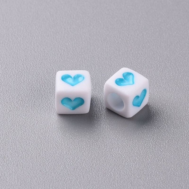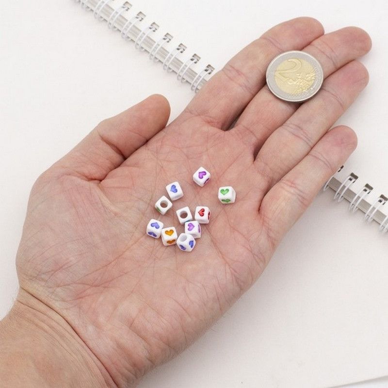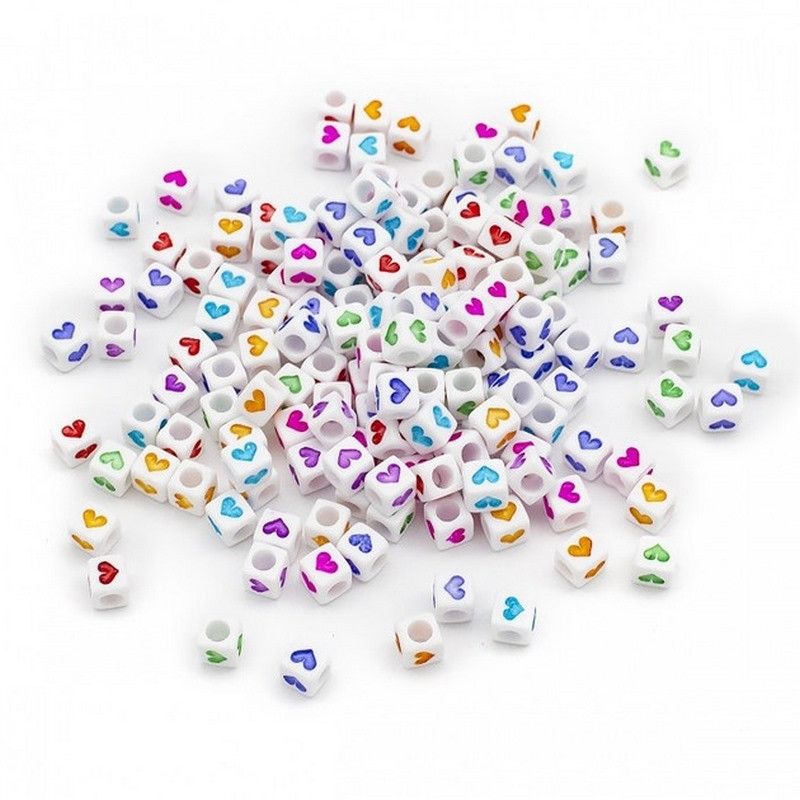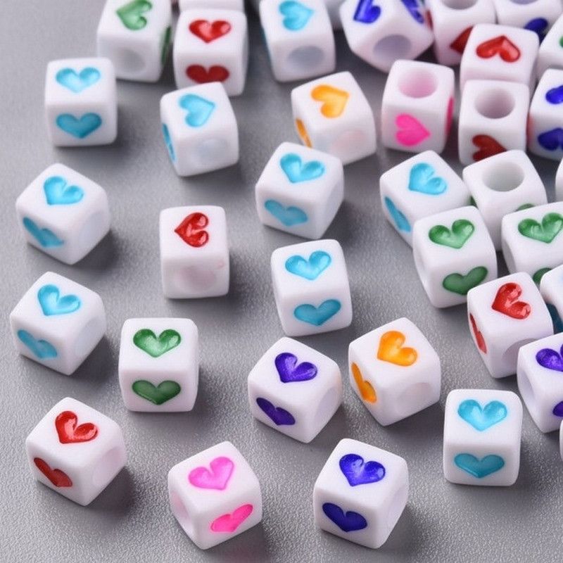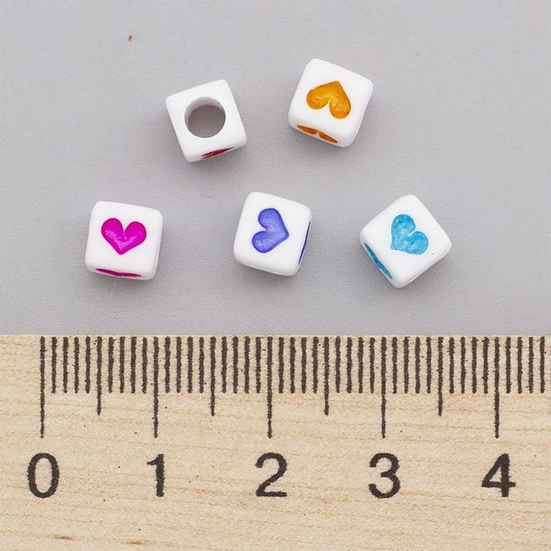 Акрилові непрозорі намистини, кубики. На кубиках різнокольорові серця. Розмір: Довжина 6.5мм, Ширина 6мм, Товщина 6мм, Отвір 3мм, Близько 150шт/25г.