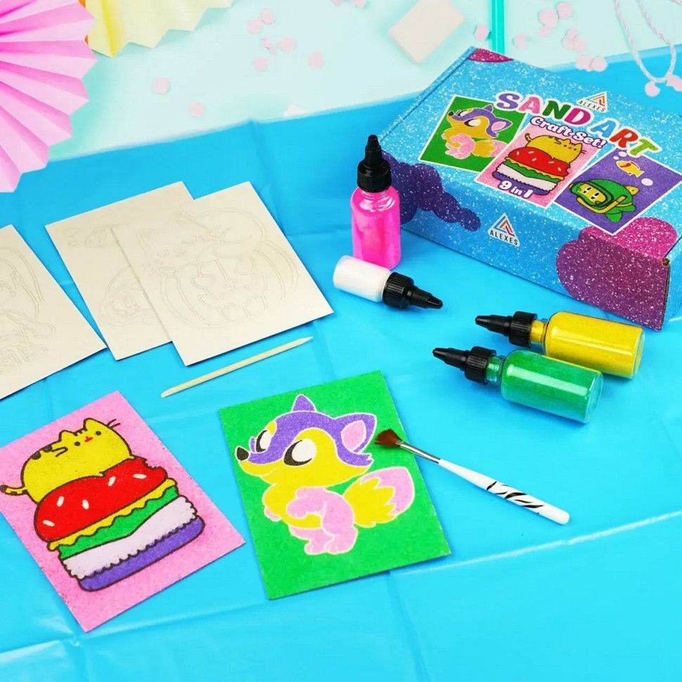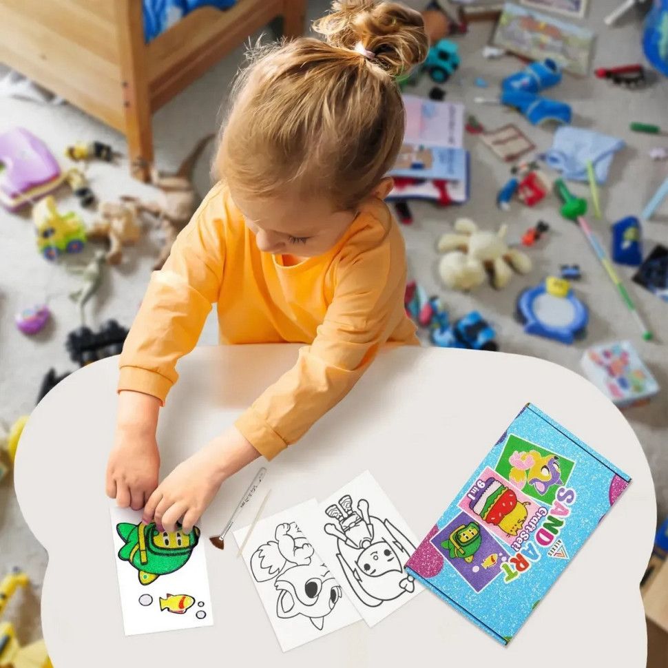 Представляємо вашій увазі новий творчий набір для малювання піском, що містить 9 різних картинок і кольорову палітру піску, які допоможуть вам створити найгарніші картини з піску.