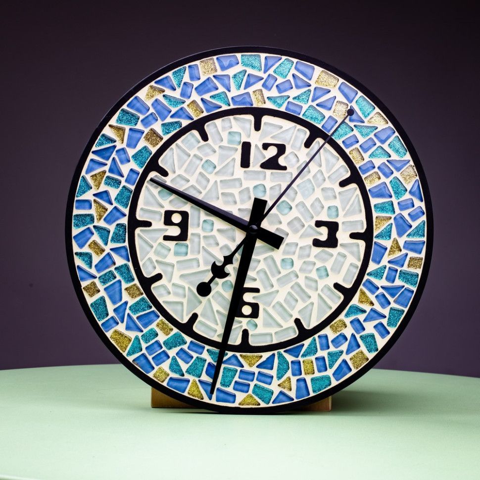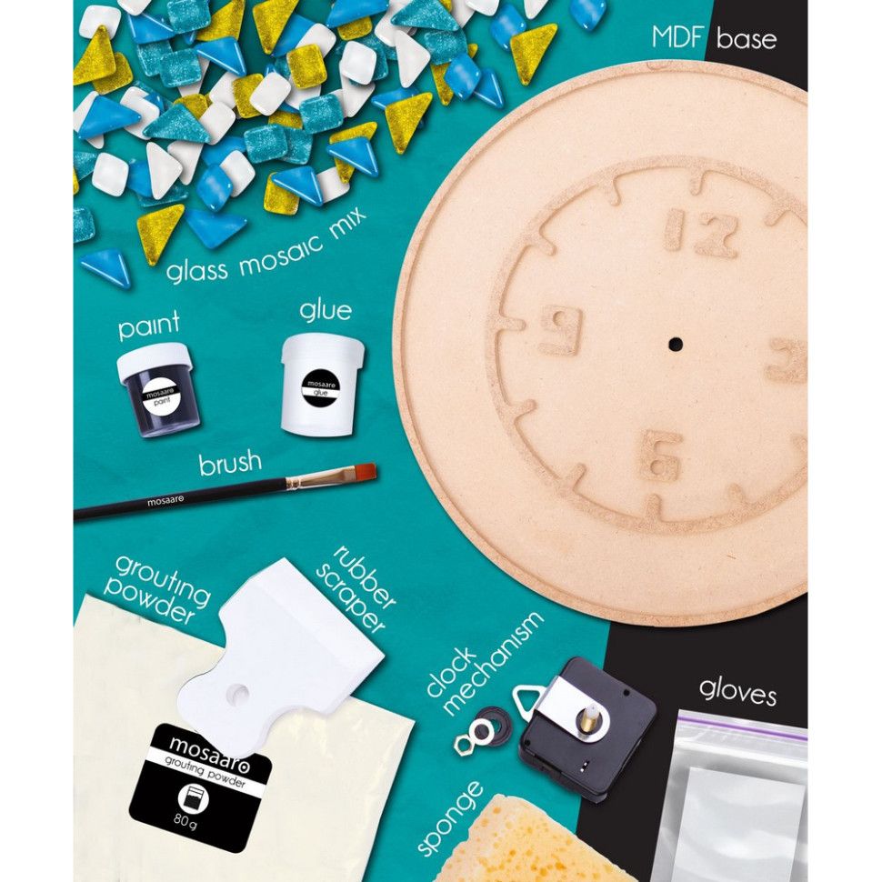 Набір містить: основу з МДФ, набір скляної мозаїки, клей на водній основі, акрилову фарбу, пензлик, шпатель, суміш для затирання швів, дерев’яну паличку для замішування, рукавички, губку, годинниковий механізм з кріпленням, мірну ложку, мішечок, попередження, інструкцію.