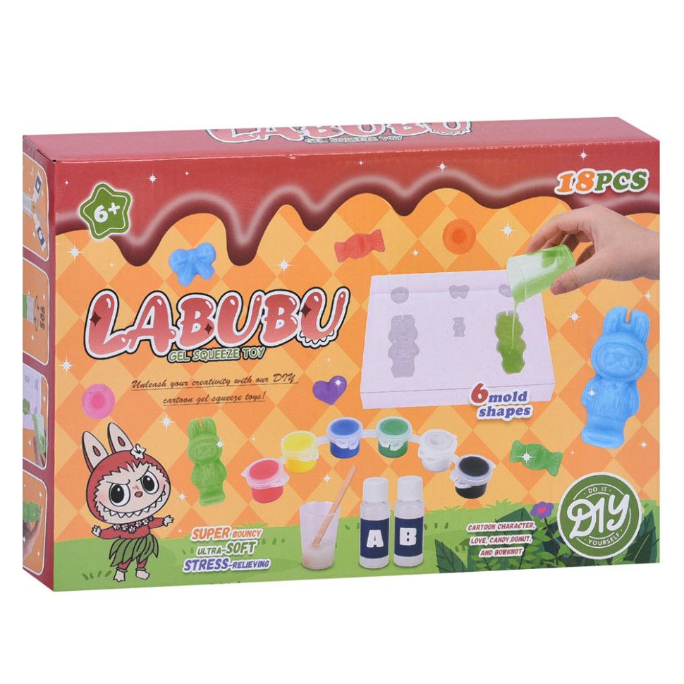 У наборі 6 молдів та 18 предметів, що дозволяють створити власного Лабубу та прикрасити його за смаком дитини. Іграшка виходить м’якою, її можна стискати та м’яти, що робить Лабубу особистим антистресом.