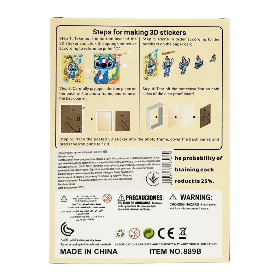 Набір для творчості «3D Картини Стіч» - це захопливий творчий комплект для дітей, які обожнюють мультсеріал «Ліло та Стіч». У наборі є яскрава картина з улюбленим героєм, дерев’яна рамка та об’ємні деталі, які кріпляться за допомогою двосторонніх наклейок.