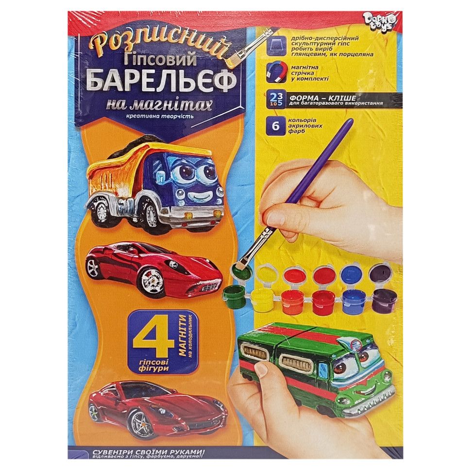 Виготовлення виробів з гіпсу - це захоплююче заняття для дитини адже вона почувається справжнім творцем. Розфарбувавши отримані гіпсові вироби акриловими фарбами із набору дитина стає ще й художником. Але це ще не все! Прикріплюємо магніти з набору та яскраві барельєфи стають справжнім подарунком для друзів та близьких! Гарні об`ємні гіпсові фігурки-магнітики стануть чудовою прикрасою будь-якого куточка вашого будинку а дитині подарують радість творчості що ні з чим не порівняна! У набір входить: Скульптурний гіпс для виготовлення гіпсового розчину Форми для виливки фігур (4 шт.) Магнітна стрічка Набір акрилових фарб для фарбування відлитого виробу (6 шт.) Пензлик Детальна інструкція-рекомендація з описом та порядком робіт що проводяться. Дрібно-дисперсійний скульптурний гіпс робить готові гіпсові барельєфи глянсовими як фарфор. Ваш маленький скульптор буде в захваті як від процесу створення фігурок так і від кінцевого результату творчої роботи малюка - фігурок на магнітах!