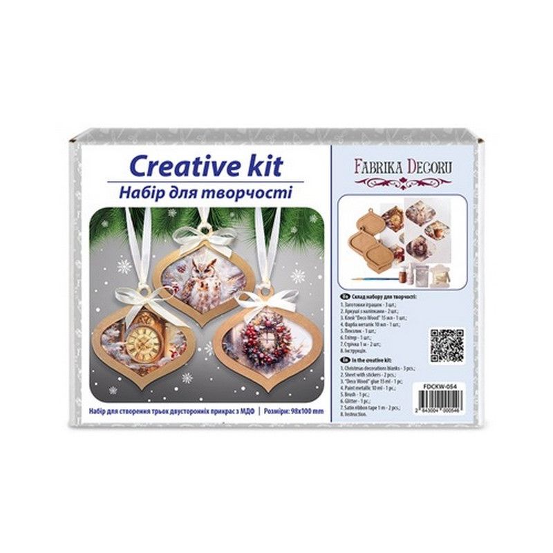 Набір включає все необхідне для створення ялинкових прикрас: заготовки з щільного ХДФ товщиною 3 мм, казкові зимові зображення, стрічки, блискітки, фарба, клей і пензлик. Вироби прості в роботі і підходять як для початківців, так і для досвідчених майстрів. Наші творчі набори - це чудовий спосіб не тільки заощадити гроші, але і весело провести час з дітьми, при цьому готові прикраси стануть прекрасним оформленням для будь-якої ялинки.