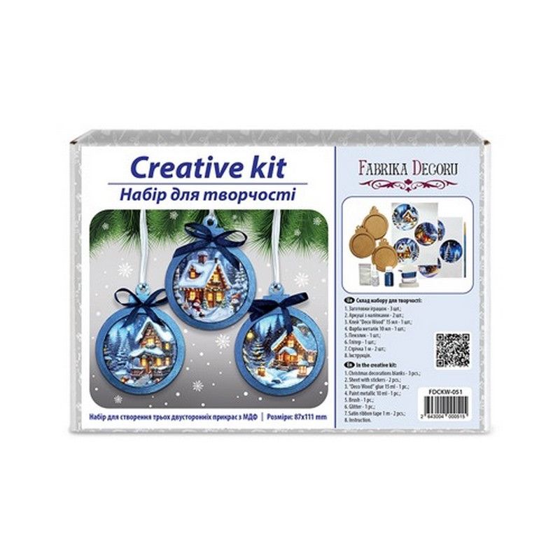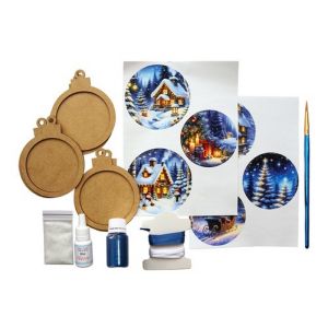 Набір включає все необхідне для створення ялинкових прикрас: заготовки з щільного ХДФ товщиною 3 мм, казкові зимові зображення, стрічки, блискітки, фарба, клей і пензлик. Вироби прості в роботі і підходять як для початківців, так і для досвідчених майстрів. Наші творчі набори - це чудовий спосіб не тільки заощадити гроші, але і весело провести час з дітьми, при цьому готові прикраси стануть прекрасним оформленням для будь-якої ялинки.