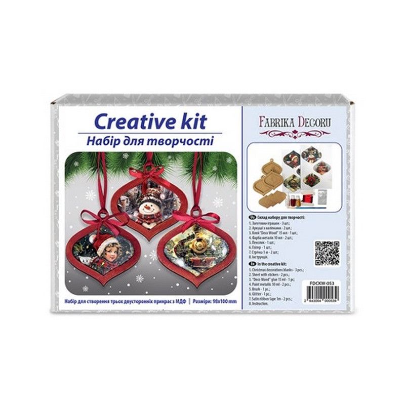 Набір включає все необхідне для створення ялинкових прикрас: заготовки з щільного ХДФ товщиною 3 мм, казкові зимові зображення, стрічки, блискітки, фарба, клей і пензлик. Вироби прості в роботі і підходять як для початківців, так і для досвідчених майстрів. Наші творчі набори - це чудовий спосіб не тільки заощадити гроші, але і весело провести час з дітьми, при цьому готові прикраси стануть прекрасним оформленням для будь-якої ялинки.