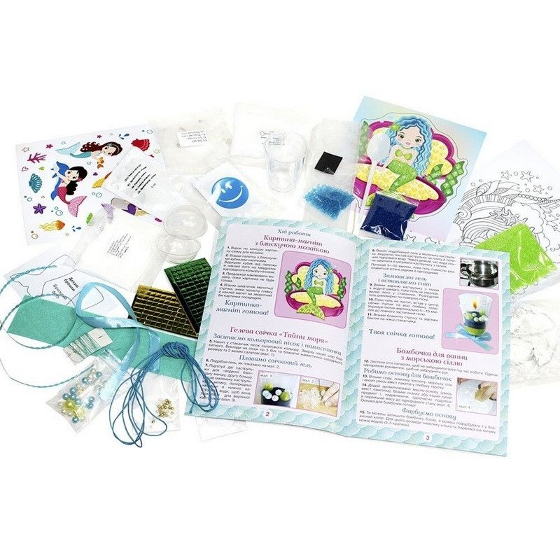 Комплектація: стаканчик, кольоровий пісок (2 кольори), фітиль, намистинки, бісер, стрічка, шнур, флакончик-кулон, фетр, стрічка з паєток, голка, булавка, нитки, волосінь, сода, морська сіль, лимонна кислота, ароматизоване масло, блістерні форми для бомбочки, одноразові рукавички, пластикова ложка, харчовий барвник, блискуча мозаїка, магніт, картинка-основа, релакс-розмальовка, яскраві наліпки, детальна інструкція.
