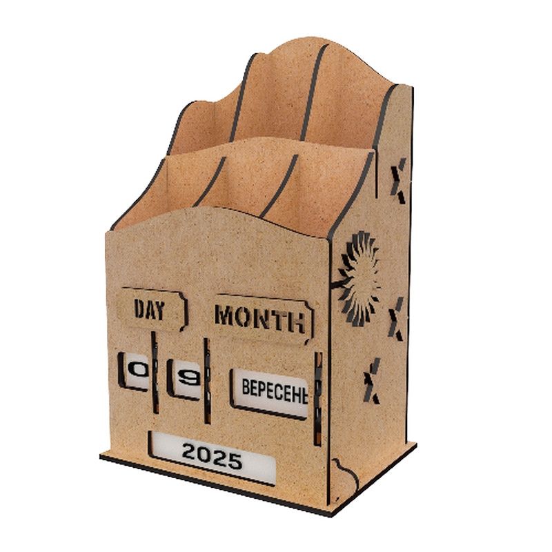 Це не просто органайзер для ручок і канцтоварів. Стильний, з вінтажною ноткою вічний календар від Fabrika Decoru, який стане справжньою окрасою вашого столу. Він послужить і функціональним аксесуаром, і оригінальним подарунком для близьких. Забудьте про набридлі кубики! Унікальний механізм на коліщатках дозволяє встановлювати дату — день, місяць і рік — простим обертанням. Керувати часом ще ніколи не було так просто!