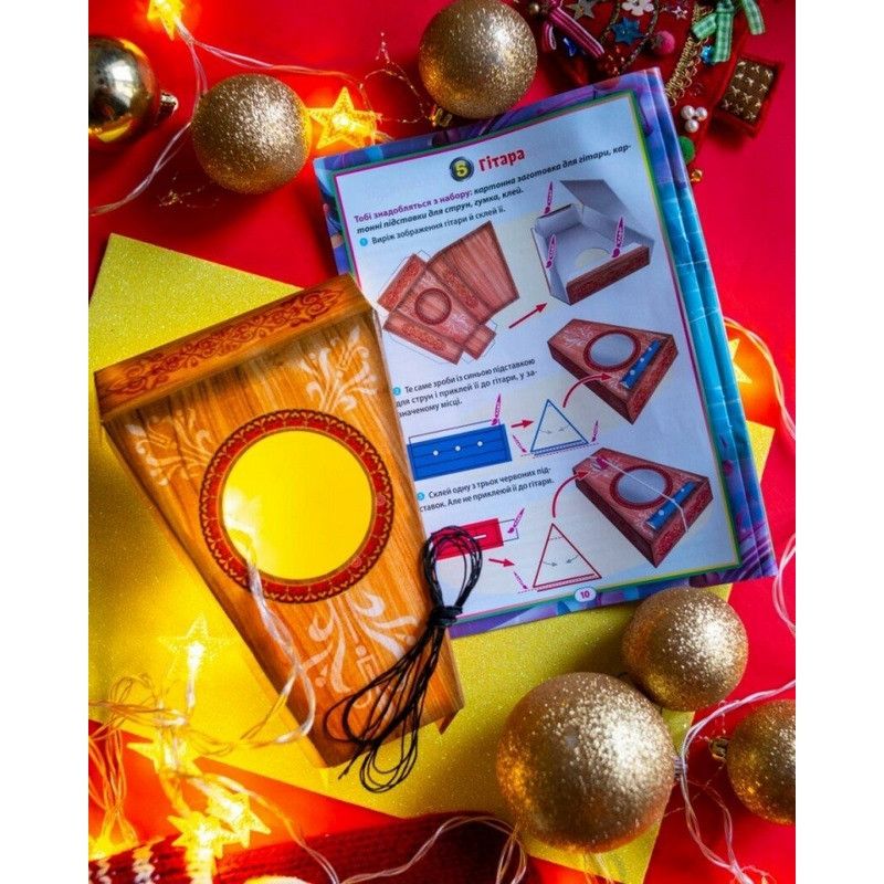 Містить: мотузка, гумка — 3 шт. дерев’яна паличка — 2 шт., скріпки — 2 шт., заготовка для брязкальця — 1 шт., гайка — 1 шт., повітряна кулька — 1 шт., захисні окуляри — 1 шт., плівка, клей, шланг — 1 шт., кольоровий пісок, стаканчики — 2 шт., картонна заготовка для гітари — 1 шт., картонні підставки для струн — 4 шт.