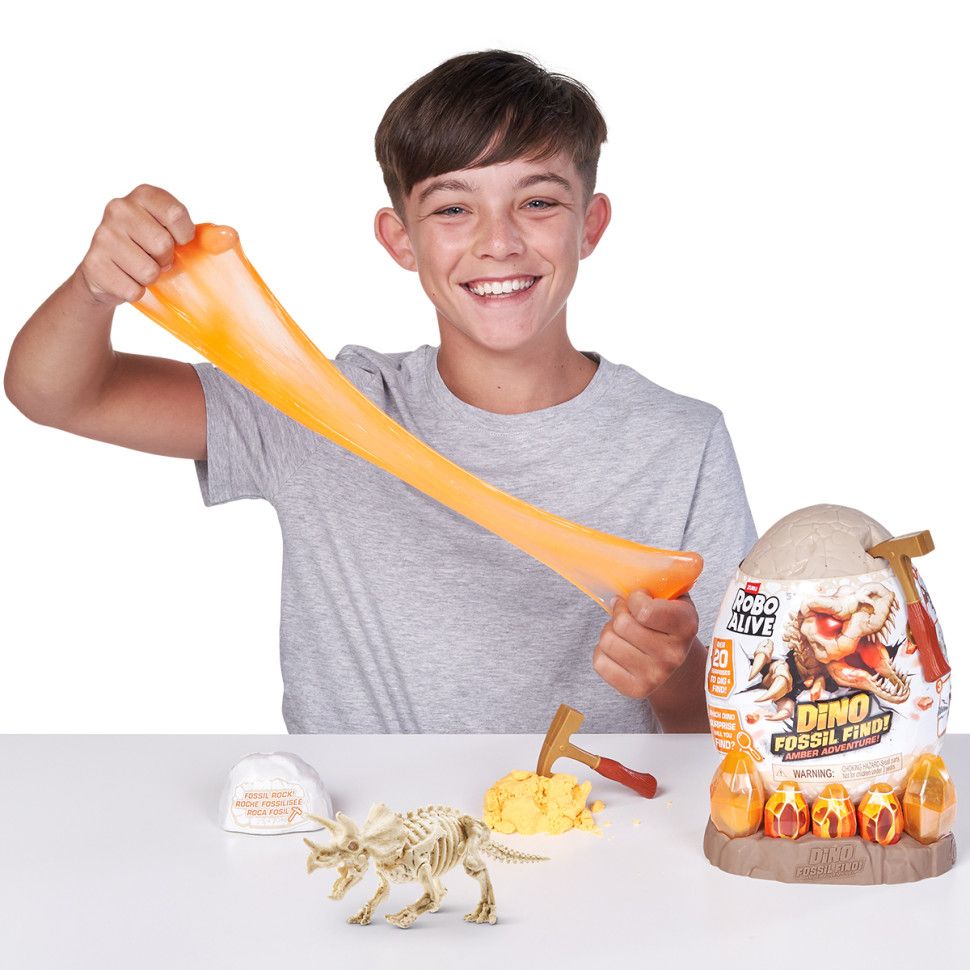Інтерактивний ігровий набір-сюрприз ROBO ALIVE - БУРШТИНОВІ РОЗКОПКИ ДИНОЗАВРА - чудовий подарунок для маленьких шанувальників динозаврів і скам'янілостей! Це величезне яйце, всередині якого знаходяться заховані частини скелета динозавра. Знайдіть усі елементи - в слаймі, в піску, в камені - та зберіть скелет!