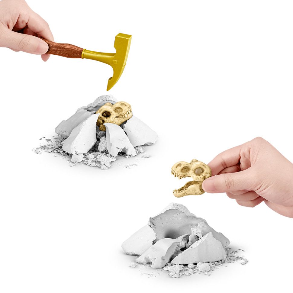 Відкривайте пакування та шукайте частини скелета. Іграшкові кістки можуть бути заховані у слаймі, у кінетичному піску чи навіть у " камені" . За допомогою спеціального інструменту розбивайте " камінь" та знаходьте частини скелета, як справжні археологи.