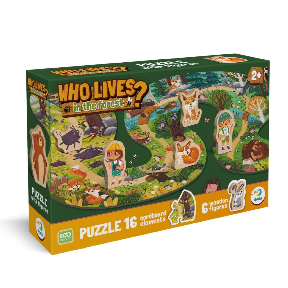 Гра поєднує пазл і сюжетну гру, допомагає розвивати уяву, дрібну моторику та логічне мислення, а також знайомить дитину з тваринами лісу. Великі деталі зручні для маленьких ручок, а екологічні матеріали — міцний картон і натуральне дерево — роблять гру безпечною та довговічною.