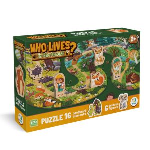 Познайомте дитину зі світом природи за допомогою пазлу "Хто живе у лісі?". Це яскрава та розвивальна гра, яка складається з 16 великих картонних деталей та 6 об’ємних дерев’яних фігурок: звірят і маленьких дослідників. Склавши доріжку, малюк може оживити гру, розставляючи персонажів і вигадуючи власні сюжети.