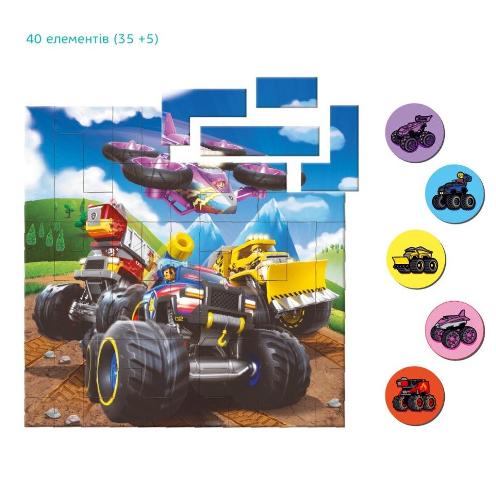 Вирушайте у світ швидкості та екстриму разом із героями Щенячого патруля! Магнітні пазли “Paw Patrol: Rescue Wheels” складаються з 35 деталей, які легко з’єднуються та надійно тримаються на магнітній поверхні. На яскравому зображенні — сміливі цуценята та потужні монстр-траки, готові до рятувальної місії.