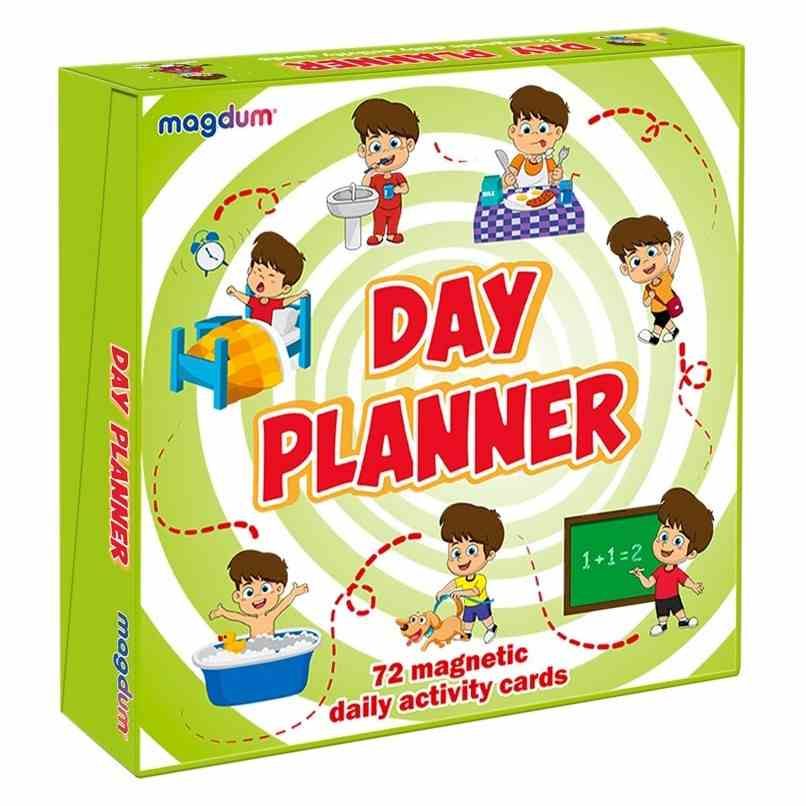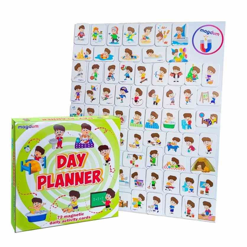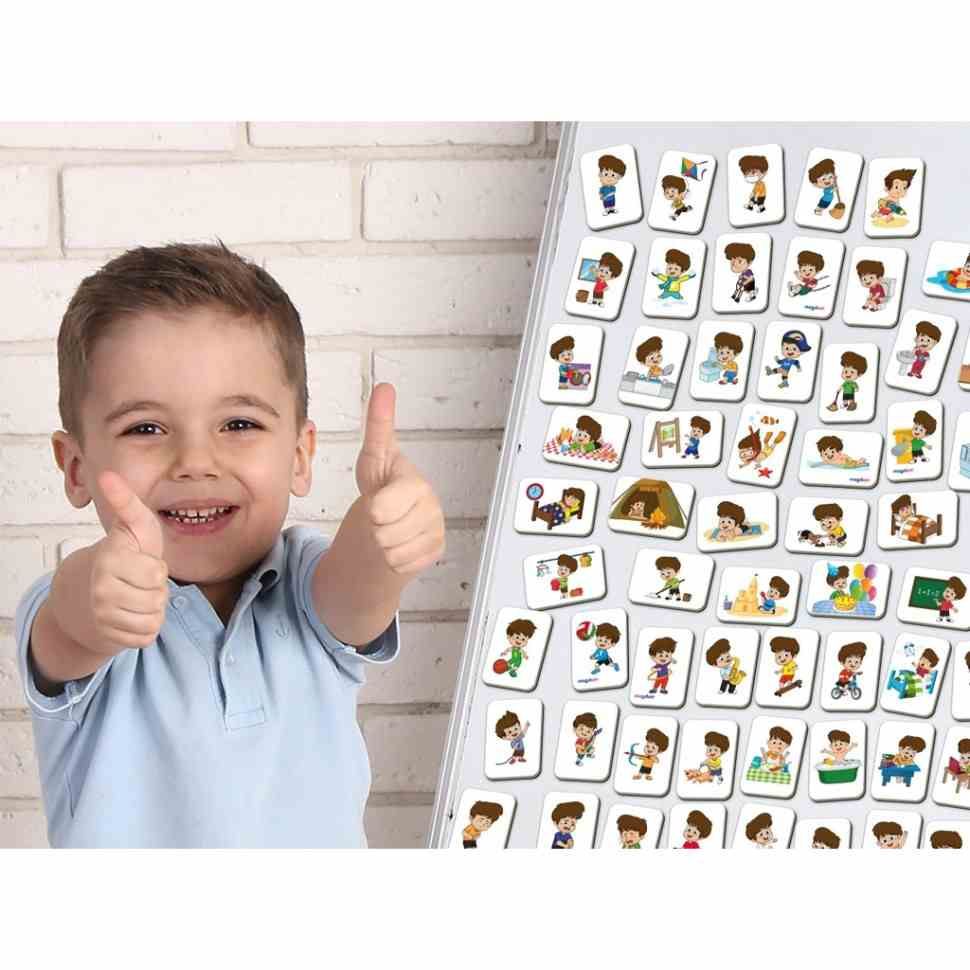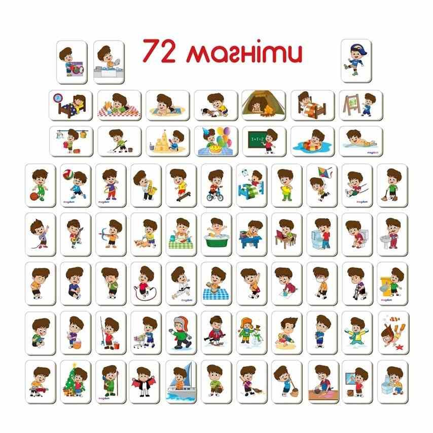 Набір містить 72 магнітні фігурки із зображеннями різних справ із різних категорій: відпочинок, ігри, навчання, заняття спортом, домашні справи, хобі, гігієна та турботи за собою, особисті обов'язки.