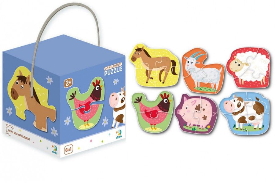 Пазли 6 в 1 Домашні тварини (2, 3, 4 елементи), Dodo В грі 6 пазлів, кожен з яких складається з двох, трьох або чотирьох елементів.