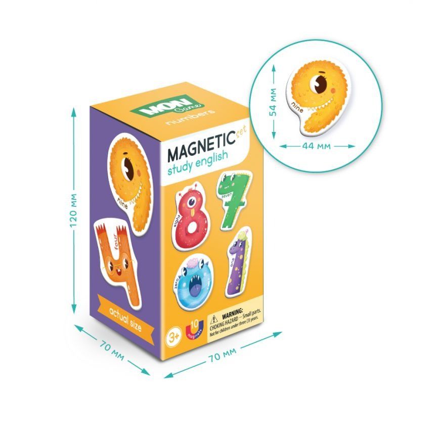 Вивчаємо англійську із найяскравішими магнітами. Тільки подивіться на ці веселі та яскраві цифри. На кожному магнітику зображується певна цифра та її назва англійською. Все, щоб малюки швидким та цікавим способом вивчали англійську. Магнітні ігри MON game – новий формат ігор, що розвивають, від улюбленого бренду. Все що для них потрібно – металева поверхня та самі магніти, які так добре кріпляться до неї.
