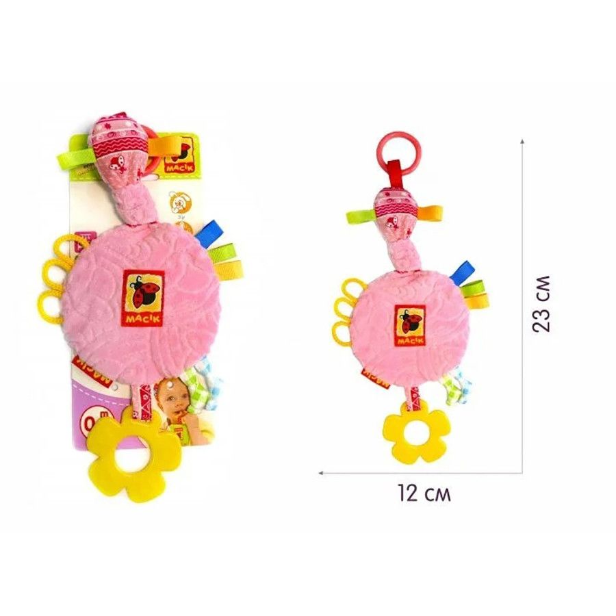 А весь секрет Забавки полягає в тому, що у неї є маса потішних вузликів і петельок, шарудіння і пищалка, а також «смачний» прорізувач.