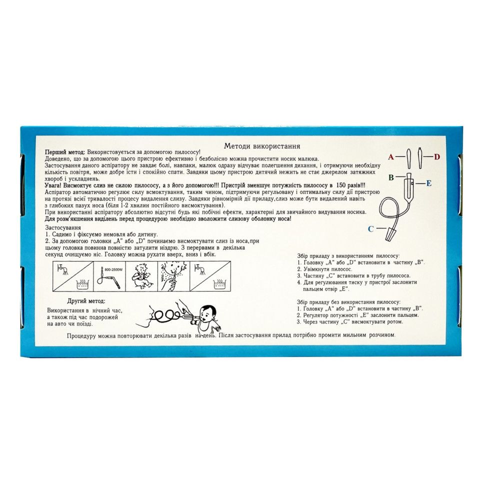 Застосування даного аспіратору не завдає болі, навпаки, малюк одразу відчуває полегшення дихання, і отримуючи необхідну кількість повітря, може добре їсти і спокійно спати. Завдяки цьому пристрою дитячий нежить не стає джерелом затяжного нежитю. Увага! Висмоктує слиз не силою пилососу, а з його допомогою! Пристрій зменшує потужність пилососу в 150 разів!