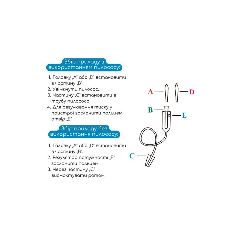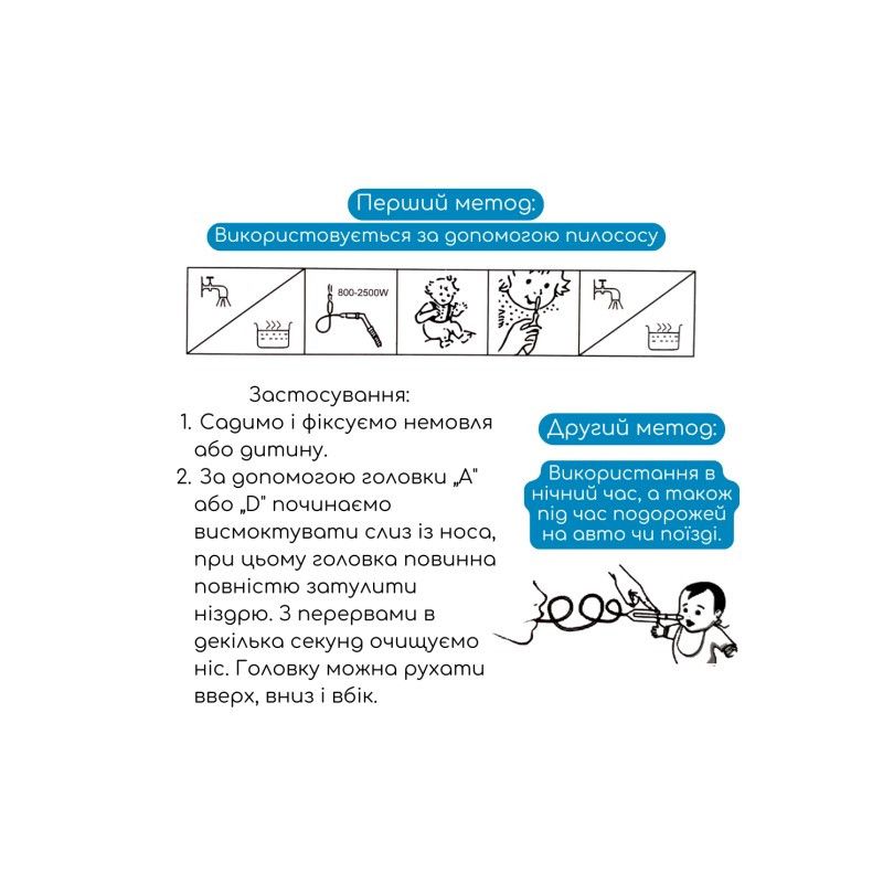 За допомогою головки "А" або "D" починаємо висмоктувати слиз із носа, при цьому головка повинна повністю затулити ніздрю. З перервами в декілька секунд очищуємо ніс. Головку можна рухати вверх, вниз і вбік.