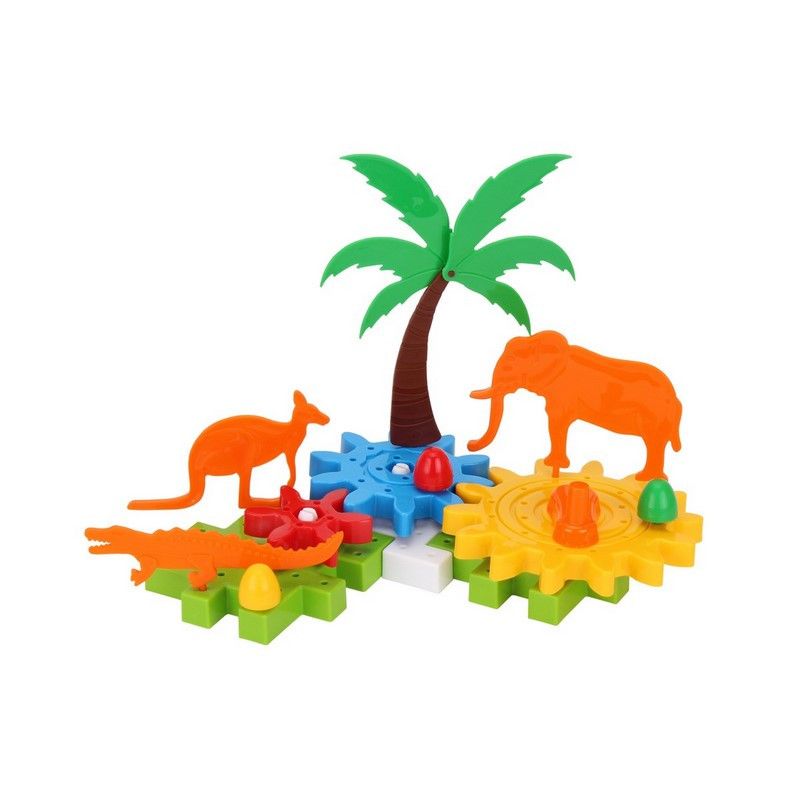 Конструктор з шестернями дарує дітям подвійну радість. 118 яскравих деталей з якісної пластмаси значно урізноманітнять процес складання конструктора та захопливі ігри з ним. Після того, як дитина об’єднає шестерні, пластини-пазли, фігурки звірів, пальми та інші елементи конструктора, вона отримає захопливу конструкцію, якою дуже цікаво гратися.