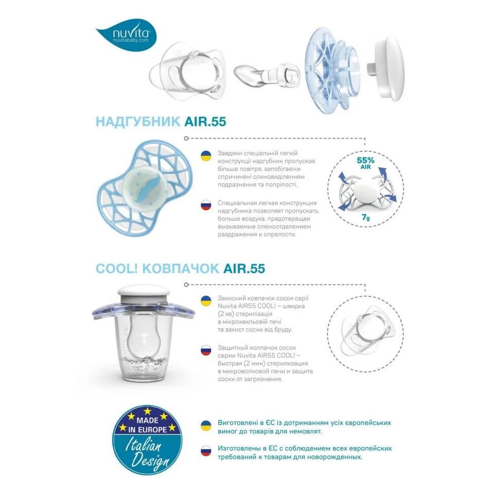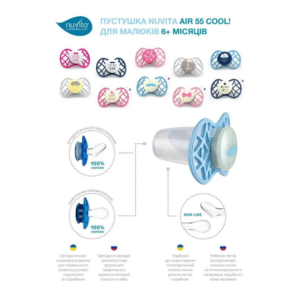 Ортодонтична пустушка серії Nuvita Air55 Cool 6m+. Пластина соски на 55% складається з повітря забезпечуючи майже повну аерацію області навколо рота, уникаючи скупчення слини, яка може подразнювати шкіру. Захисний ковпачок для соски для підтримки чистоти соски і стерилізації в мікрохвильовій печі простим додаванням води.