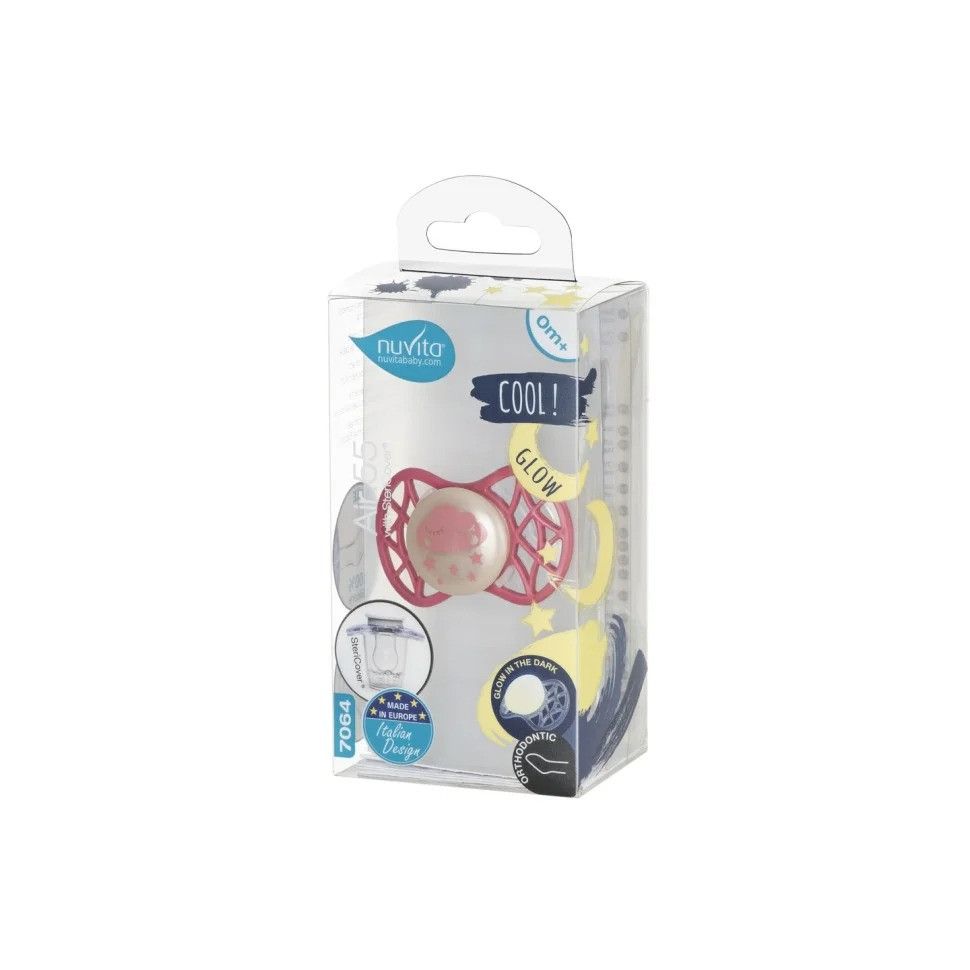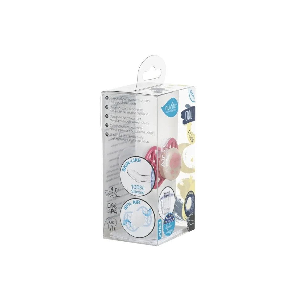 Ортодонтична пустушка Air55 Cool, яка світитися в темряві. Платівка соски на 55% складається з повітря забезпечуючи майже повну аерацію області навколо рота, уникаючи скупчення слини, яка може дратувати шкіру. Захисний ковпачок для соски для підтримки чистоти соски і стерилізації в мікрохвильовій печі простим додаванням води.