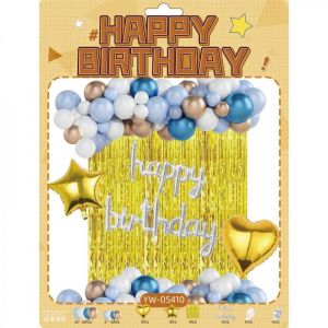 Набір містить 35 кульок діаметром 10" різних відтінків та 15 кульок діаметром 5", що забезпечує плавний об’ємний перехід у композиції. У комплект також входять 1 фольговане серце, 1 фольгована зірка, декоративна шторка-"дощик", напис Happy Birthday, стрічка для кріплення та рулон клейових точок.